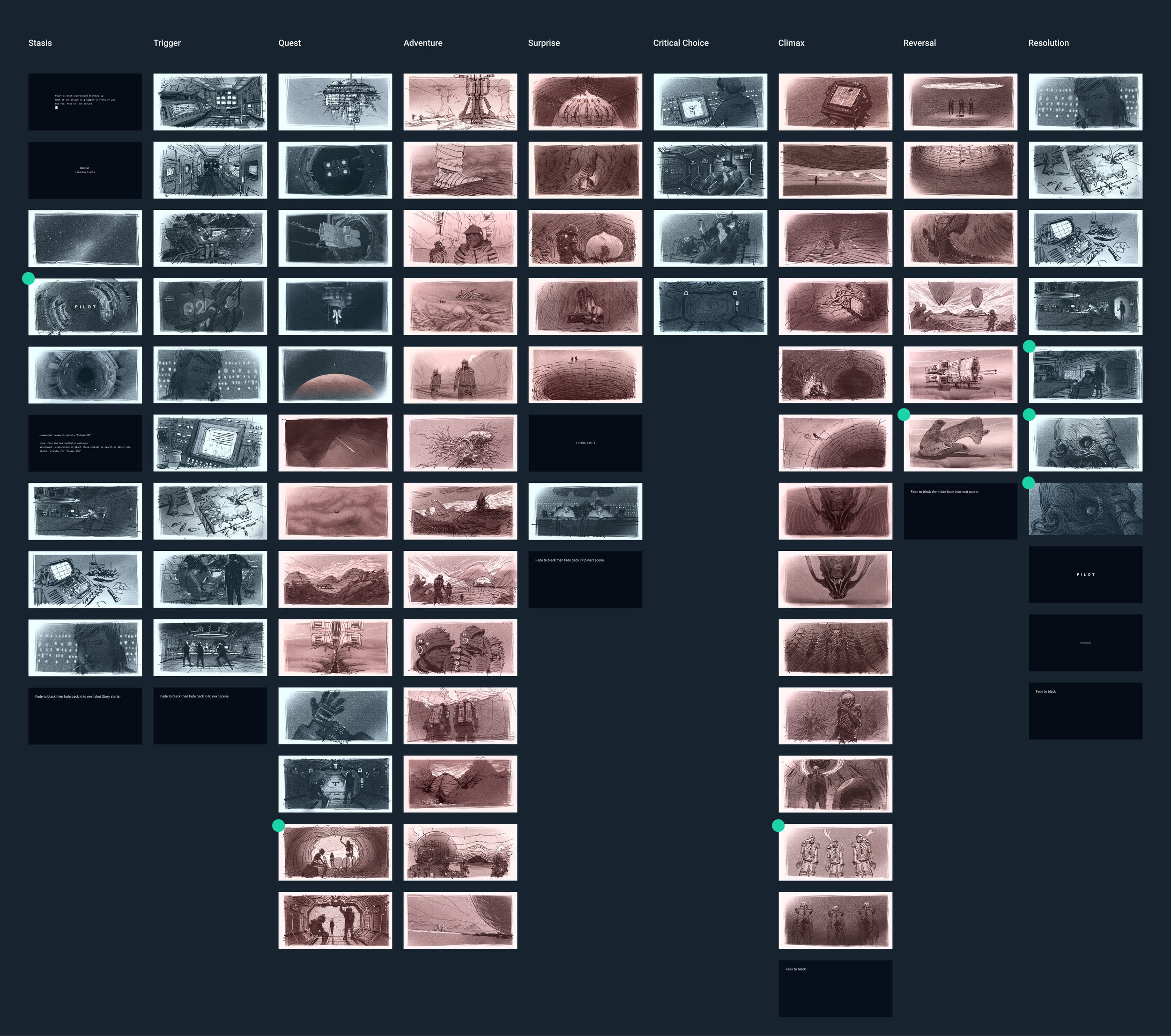 Delivery: Given Pilot is only a slice of a longer narrative, and I don’t have enough time to flesh out characters just with visual animation, I will use conventional mechanics that enable efficient storytelling. For example, I’ll use monologue to anchor the story around a single character. This will tighten the focus so I can move quickly through character interaction and story beats. Also, I will focus on key scenes that drive the narrative and flavor the world. I’m going for a very moody feel that’s dipped in nuance. So, Viewers will benefit from having seen the first Alien film. I will also layer detail thru environmental storytelling. The backstory is there to be discovered rather than handed to the viewer.